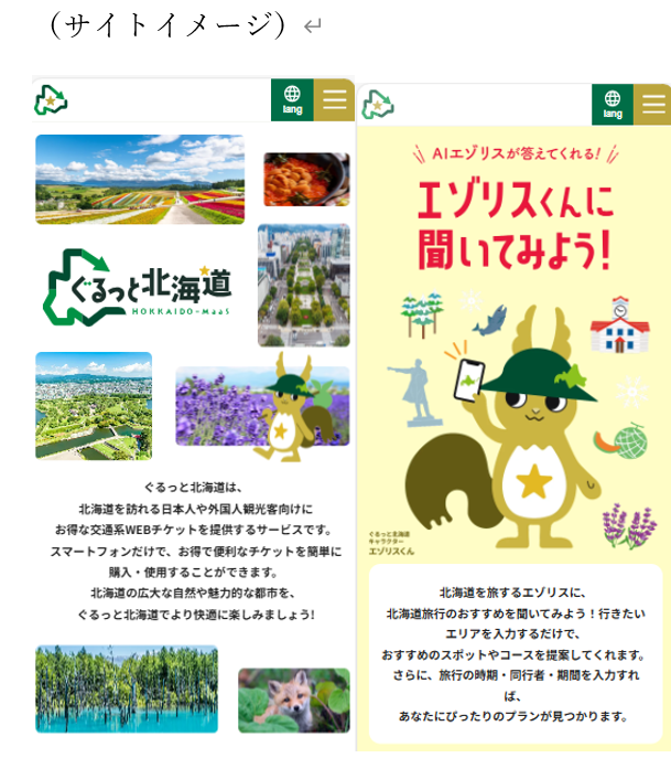 本サイトは、北海道内のバスや鉄道など50以上のデジタルチケットを全13言語で販売する機能に加え、Googleの生成AI「Gemini」を搭載したAIチャットボットを実装。「エゾリス」のキャラクターが、利用者に最適な「モデルコースとおすすめチケット」を提案します。国内外の観光客の利便性を飛躍的に高め、北海道の広域周遊と地域経済の活性化を目指します。